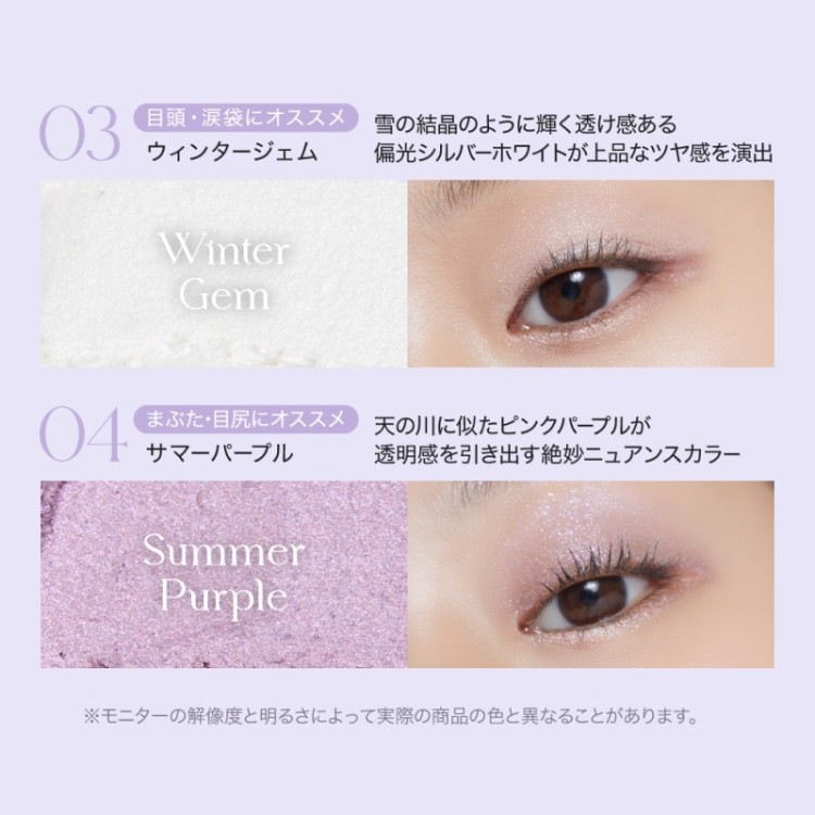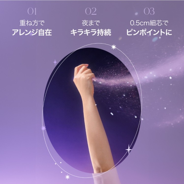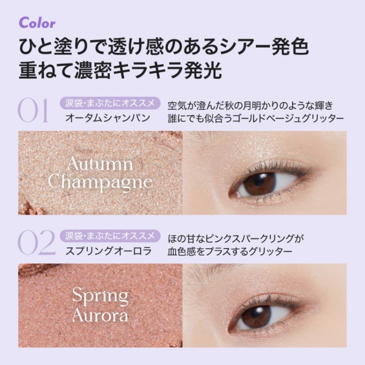 ひと塗りで透け感のあるシアー発色、重ねて濃密キラキラ発光の重ね方次第でアレンジできる万能グリッター