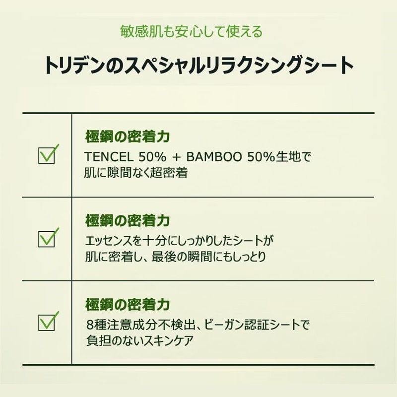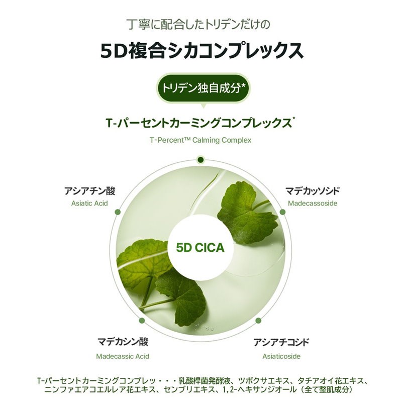 ※トリデン独自のT-パーセントカーミングコンプレックス:乳酸桿菌発酵液、ツボクサエキス、タチアオイ花エキス、ニン ファエアコエルレア花エキス、センブリエキス、1,2-ヘキサンジオール / 全て整肌成分)、マデカッソシド、アシアチコシド、マデカシン酸、アシアチン酸、アシアチン酸(全て保湿成分)