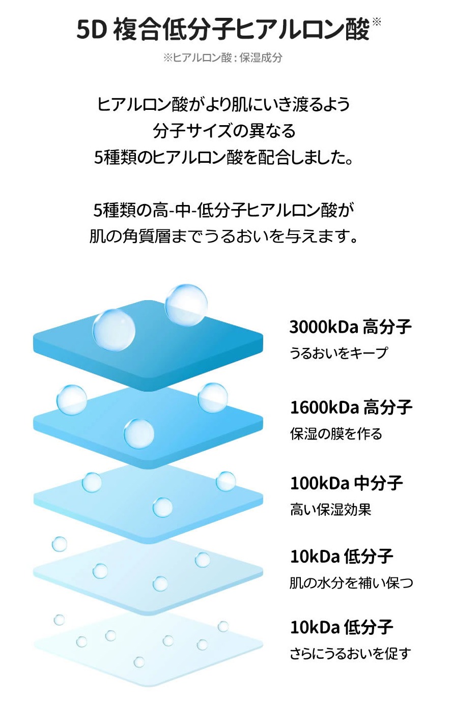 5Dー複合ヒアルロン酸はお肌へ吸収されやすくしっとりしながらもサラサラした仕上りが特徴です。