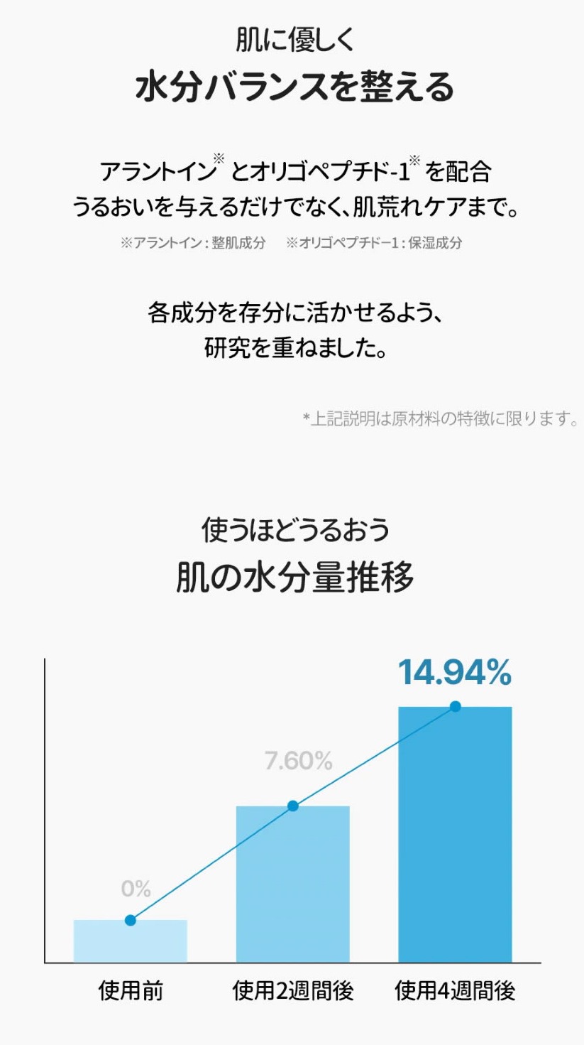 全成分 / 水、BG、グリセリン、1,2−ヘキサンジオール、水添ジデセン、アラントイン、トレハロース、ハマメリスエキス、パンテノール、加水分解ヒアルロン酸、ヒアルロン酸Na、ヒアルロン酸クロスポリマーNa、アセチルヒアルロン酸Na、加水分解ヒアルロン酸Na、(アクリル酸グリセリル/アクリル酸)コポリマー、(メチルビニルエーテル/マレイン酸)コポリマー、(アクリル酸ヒドロキシエチル/アクリロイルジメチルタウリンNa)コポリマー、2,3−ブタンジオール、セテアリルアルコール、(C14−22)アルコール、(C12−20)アルキルグルコシド、ペンチレングリコール、イソステアリン酸ソルビタン、トリ(カプリル酸/カプリン酸)グリセリル、メリアアザジラクタ葉エキス、メリアアザジラクタ花エキス、コクシニアインディカ果実エキス、ナス果実エキス、カミメボウキ葉エキス、ウコンエキス、サンゴモエキス、ラベンダー花エキス、オニサルビアエキス、ヒアシンスエキス、カミツレ花エキス、ルリジサエキス、ヤグルマギクエキス、EDTA−2Na、カルボマー、トロメタミン、キサンタンガム、グルタチオン、孔雀石抽出物、エチルヘキシルグリセリン