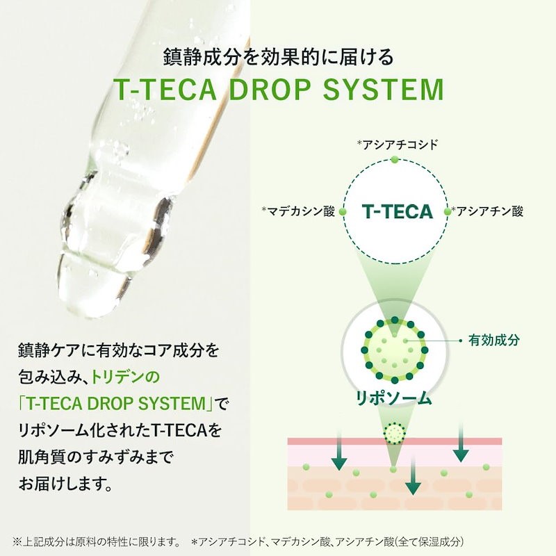 全成分 / 水、BG、グリセリン、DPG、1,2−ヘキサンジオール、グリセレス−26、パンテノール、ツボクサエキス、カルボマー、トロメタミン、エチルヘキシルグリセリン、キサンタンガム、(アクリル酸グリセリル/アクリル酸)コポリマー、(メチルビニルエーテル/マレイン酸)コポリマー、アラントイン、ベタイン、EDTA−2Na、加水分解ヒアルロン酸、ヒアルロン酸Na、メリアアザジラクタ葉エキス、プロパンジオール、イソペンチルジオール、酢酸Na、メリアアザジラクタ花エキス、ジペプチド−2、オレイン酸ポリグリセリル−4、カプリロイルサリチル酸、乳酸桿菌発酵液、カプロン酸、ヒアルロン酸、ヒアルロン酸ヒドロキシプロピルトリモニウム、ヒアルロン酸K、ヒアルロン酸クロスポリマーNa、ステアロイルグルタミン酸Na、アシアチコシド、マデカシン酸、サーファクチンNa、グリチルリチン酸2K、センブリエキス、アシアチン酸、ペンチレングリコール、マデカッソシド、ニンファエアコエルレア花エキス、タチアオイ花エキス、アセチルヒアルロン酸Na