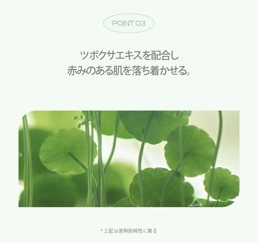 明るい緑の色が赤みを補正します。ツボクサ葉エキスを含んで、赤ら顔な肌を鎮静します。