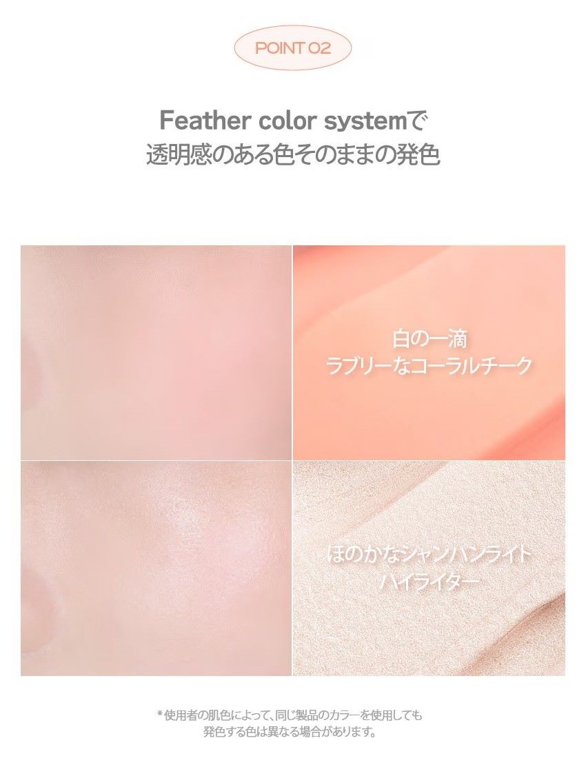 ひと滴の白さ、可愛らしいコーラルのチークとほのかなシャンパン色のハイライター