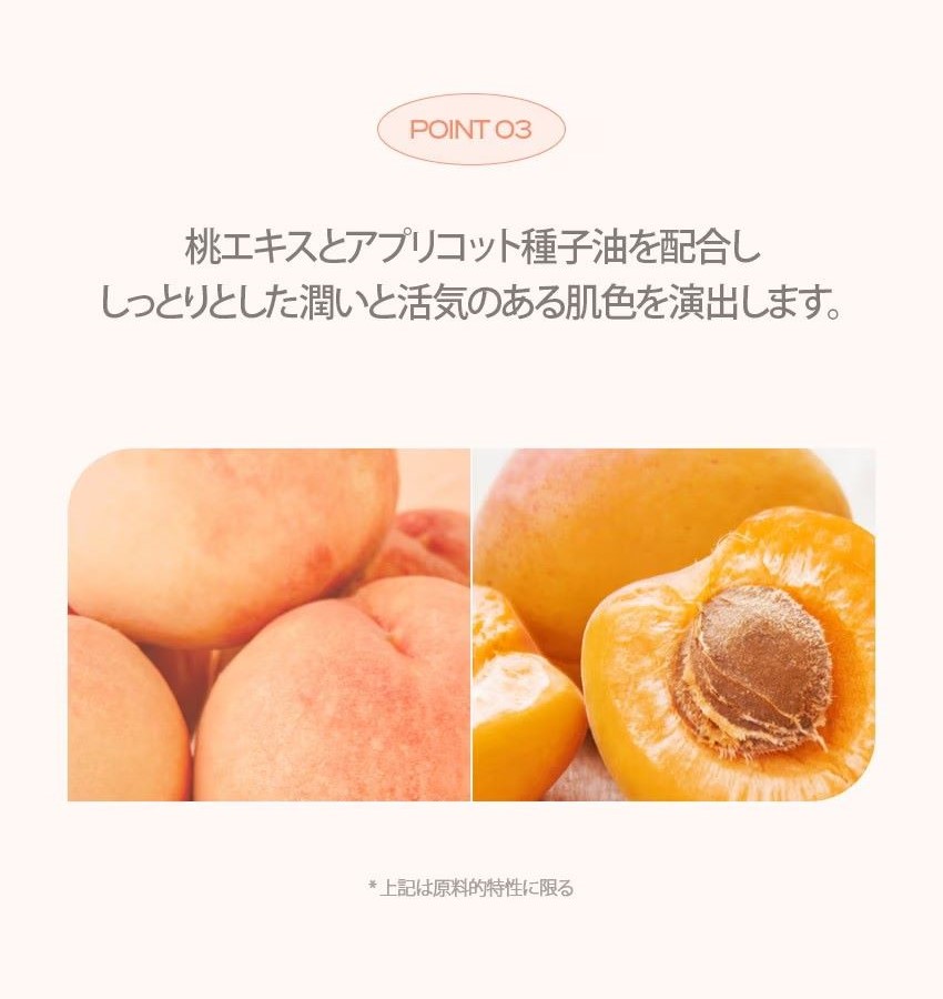 #Warm Lighter:桃のエキスとアプリコットオイルを含んで、しっとりとした生き生きとした肌色を提供します。