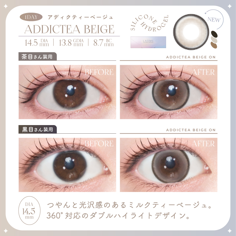 ◆DIA 14.5mm(アディクティーベージュ、ウォーターティントブラウン、アイスグレーブラウン、スノーブルー、ピュールリング)