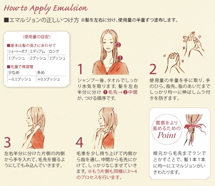 ●タオルドライ後、適量を手のひらでよくのばし、毛先中心に塗布し、髪全体によくなじませます。