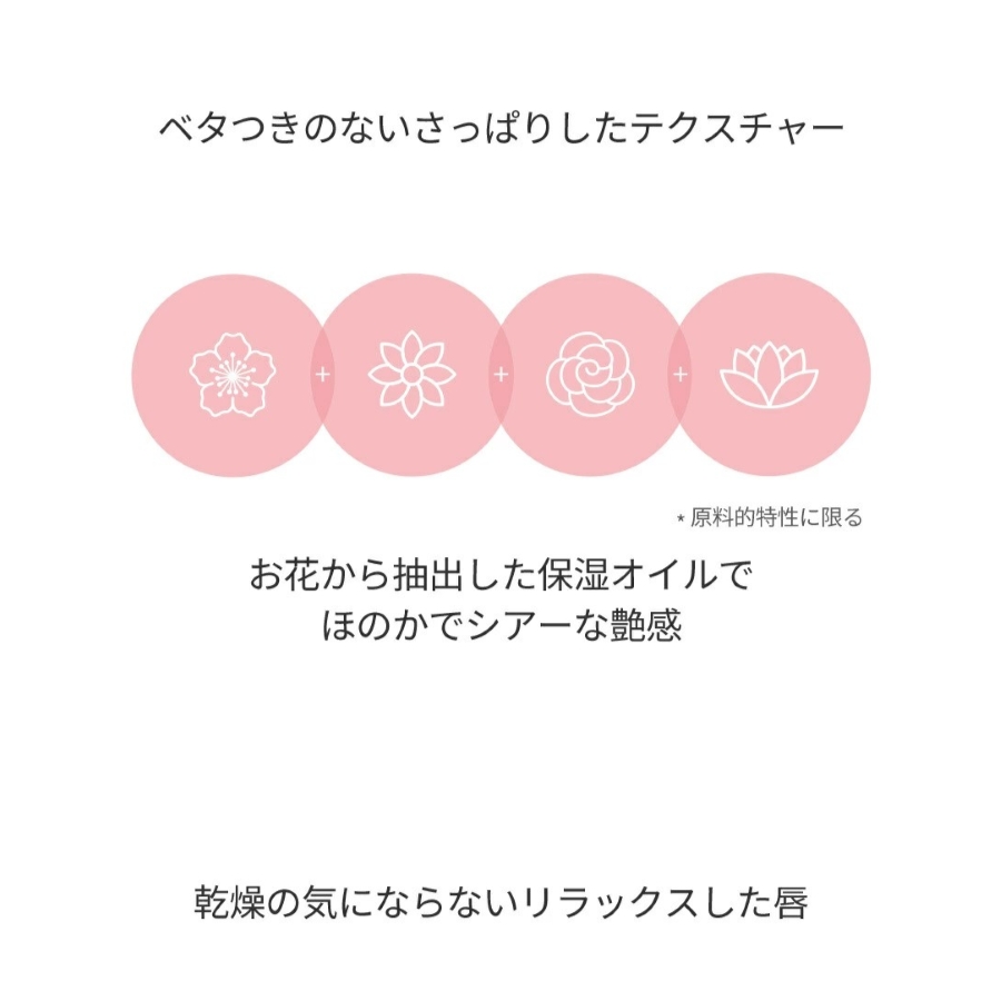 「シアーティンテッドスティック」は、桜、スイレン、バラ、蓮の4つの花から抽出したオイル配合で、乾燥しにくく塗った瞬間のツヤツヤ感を長時間持続させることが可能な優れもの。